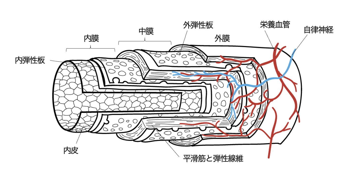 血管壁は、基本的に内膜、中膜、外膜の3層から構成される