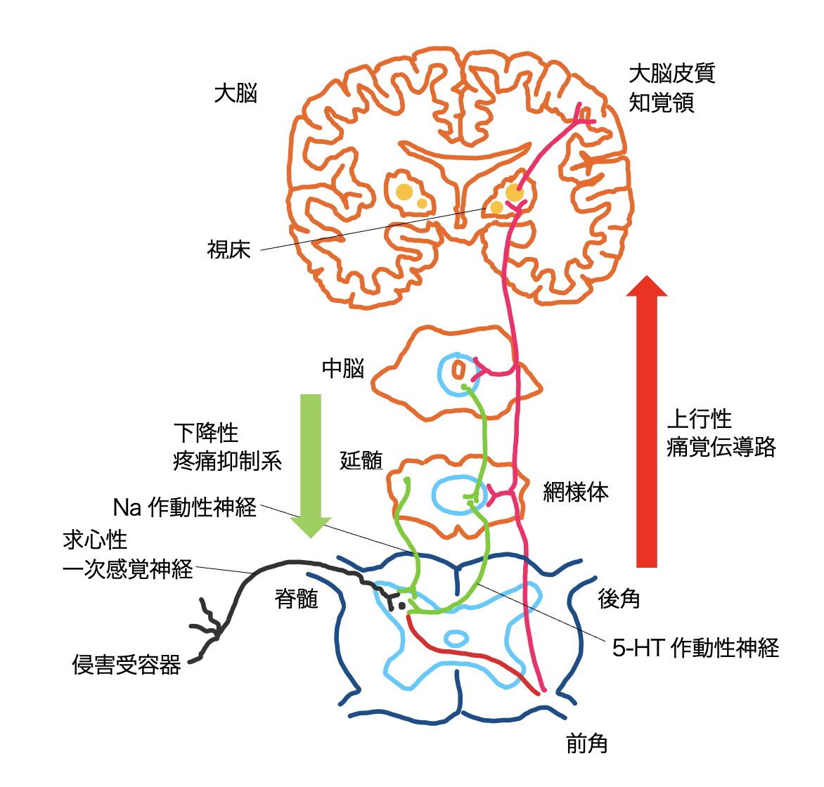 痛覚情報は、一次感覚神経を経て脊髄後角に入り、シナプスを介して二次ニューロンに伝達される。その後、上行性の経路を通って脳へ到達し、痛みとして認識される。