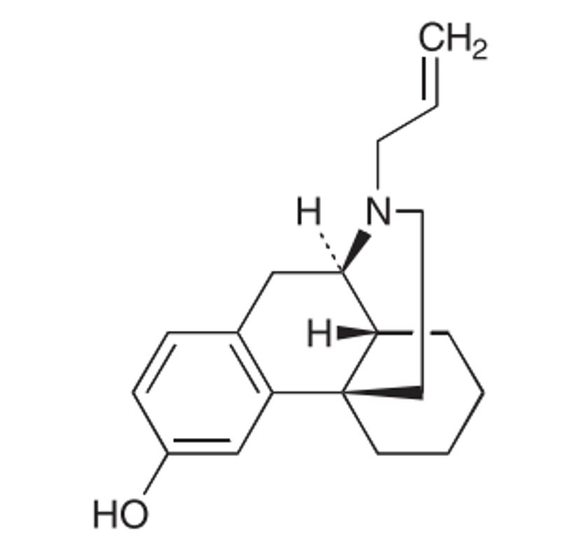 麻薬拮抗薬は、モルヒネなどのオピオイド鎮痛薬が作用するμ受容体などに結合し、その活性を阻害する薬剤である。これにより、過量投与や中毒時に生じる呼吸抑制や意識障害を速やかに改善することができる。オピオイド依存症や副作用対策、さらには消化管への作用を抑えるためにも使用される。モルヒネのN-メチルをN-アリルに置換した構造をしている。