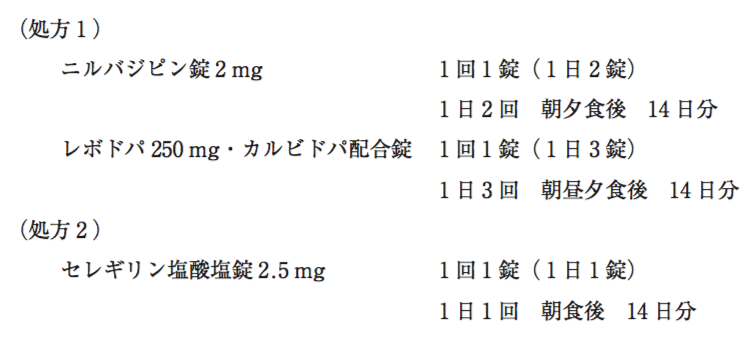 78歳女性。高血圧症とパーキンソン病で処方1を服用していた。パーキンソン病症状のコントロールが困難になったため、新たに処方2が追加された。