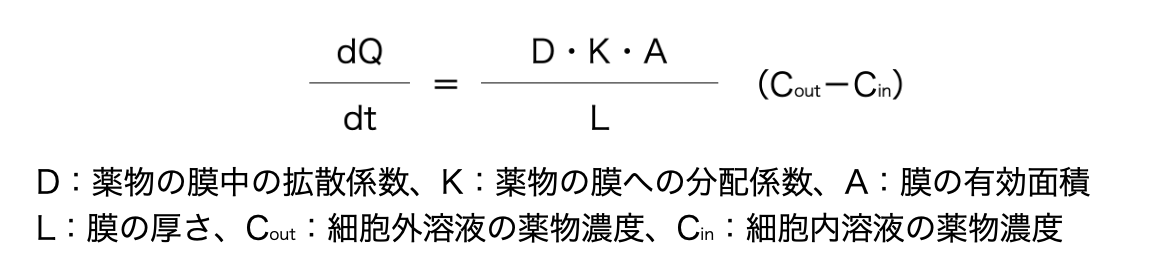Fickの法則において、薬物分子が単位時間に膜を透過する量dQ/dtは、下記の式で表される。